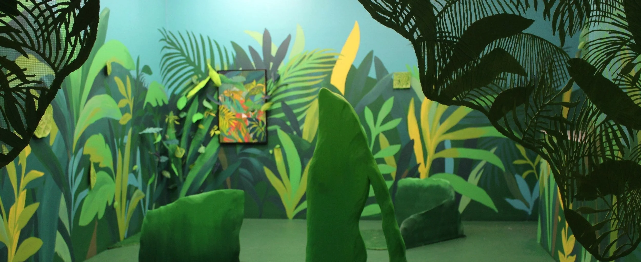 The installation of the work subverts the standard gallery mode of passive viewing within a static white cube; conceived in a manner that the viewer is compelled to navigate around the artworks, stepping over or passing through them. The space necessitates the viewer to be present in order to activate it as a means of drawing attention to the invisible structures we create and how they work to separates us. The viewer, seduced by colors and textures, is lost in dense and tactile walls of tropical foliage, often missing the figures existing within the artwork. Read full press release